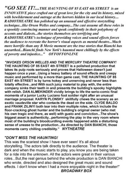 Dan Bianchi’s “The Haunting of 85 East 4th Street” is most eerily effective when real life and real history trumps the paranormal. Told in the intimate Red Room theater, located on the upper level of — wouldn’t you know it, 85 East 4th Street — the Radiotheatre acting troupe has constructed an old-fashioned radio show, incorporating sound effects, impersonations and a flair for the melodramatic. Era by era, the show’s four performers recount the sordid history of this building. It’s stood through times of plagues, prejudice and paranoia — even before construction, the land itself was thought to be cursed — and handfuls of people have been found dead inside, including one who was thrown down the building’s staircase so hard he cracked the first floor’s tiles. These historical accounts keep this piece of radio theater moving forward. Things stall, though, when that history is occasionally molded for quick scares, as when the cast claims a dead woman’s screams can still be heard through the walls. To Bianchi’s credit, it’s the cold hard truth that sucks us in. And while we’re not going to go home shrieking in terror, one can’t help but notice the cracked tiles at the bottom of that staircase and those other buildings lining East 4th Street, each with their own silent mysteries.THE VILLAGER